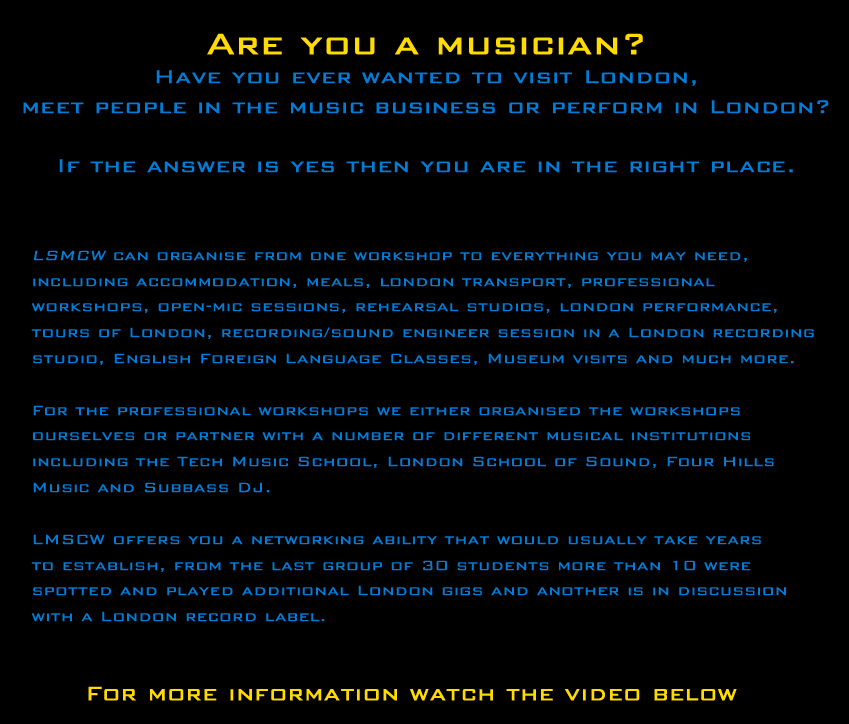LSMCW can organise from one workshop to everything you may need, including accommodation, meals, London transport, professional workshops, open-mic sessions, rehearsal studios, London performance, tours of London, recording/sound engineer session in a London recording studio, English Foreign Language classes, museum visits and much more. For the professional workshops we either organise the workshops ourselves or partner with a number of different musical institutions including The Tech Music School, London School of Sound, Four Hills Music and Subbass DJ.LMSCW offers you a networking ability that would usually take years to establish, from the last group of 30 students more than 10 were spotted and played additional London gigs and another is in discussion with a London record label.